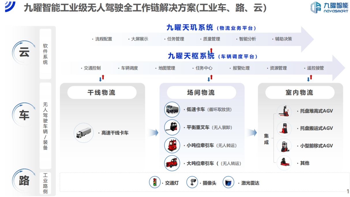 九曜智能主要研发制造工业级场间物流无人驾驶产品及L4级别工程车辆无人驾驶解决方案,如无人牵引车、无人平衡重叉车、无人卡车及自动驾驶改装套件等,产品已广泛应用于汽车主机厂及上下游供应商、快消品、机场、电力、石油化工行业等几十家客户。自主开发的“工业级全工作链无人驾驶全系列产品”,是目前国内唯一可以实现工业物流领域全流程无人作业的产品。
